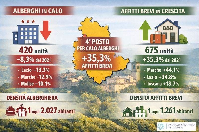 Le differenze emergono con chiarezza anche a livello provinciale. In provincia di Terni la flessione degli alberghi è più marcata (–11,3%, da 80 a 71 strutture), mentre in provincia di Perugia il calo si ferma al –7,7%. Sul fronte degli affitti brevi, Terni registra l’incremento percentuale più elevato (+39,6%), mentre Perugia cresce del 34,2%, confermandosi il principale bacino dell’offerta regionale.