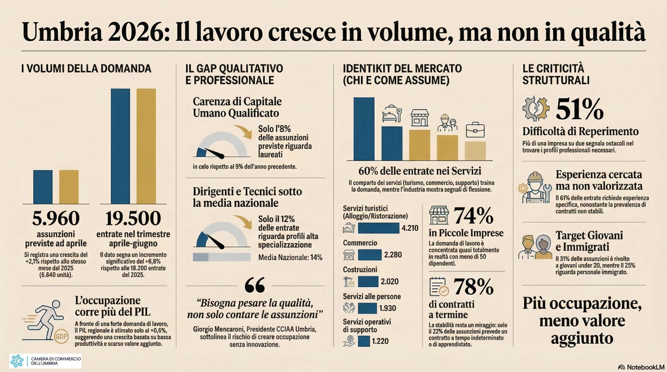 Il dettaglio settoriale conferma la direzione generale. Rispetto ad aprile 2025, il report registra +30 entrate nel settore primario e +180 nei servizi, mentre l’industria perde 80 entrate nel mese; sul trimestre aprile-giugno, il saldo è di +160 nel primario, +1.090 nei servizi e -10 nell’industria. Nei principali comparti, ad aprile, le imprese umbre programmano 1.350 entrate nei servizi di alloggio e ristorazione e nei servizi turistici, 720 nel commercio, 560 nelle costruzioni, 510 nei servizi alle persone e 360 nei servizi operativi di supporto alle imprese e alle persone. Nel trimestre i valori salgono rispettivamente a 4.210, 2.280, 2.020, 1.930 e 1.220. È una geografia dell’occupazione che racconta bene dove oggi cresce la domanda: soprattutto nei servizi, nei comparti a più alta intensità operativa, nella cura, nell’accoglienza, nelle attività di supporto; molto meno nelle funzioni capaci di trascinare innovazione, managerialità e specializzazione avanzata.