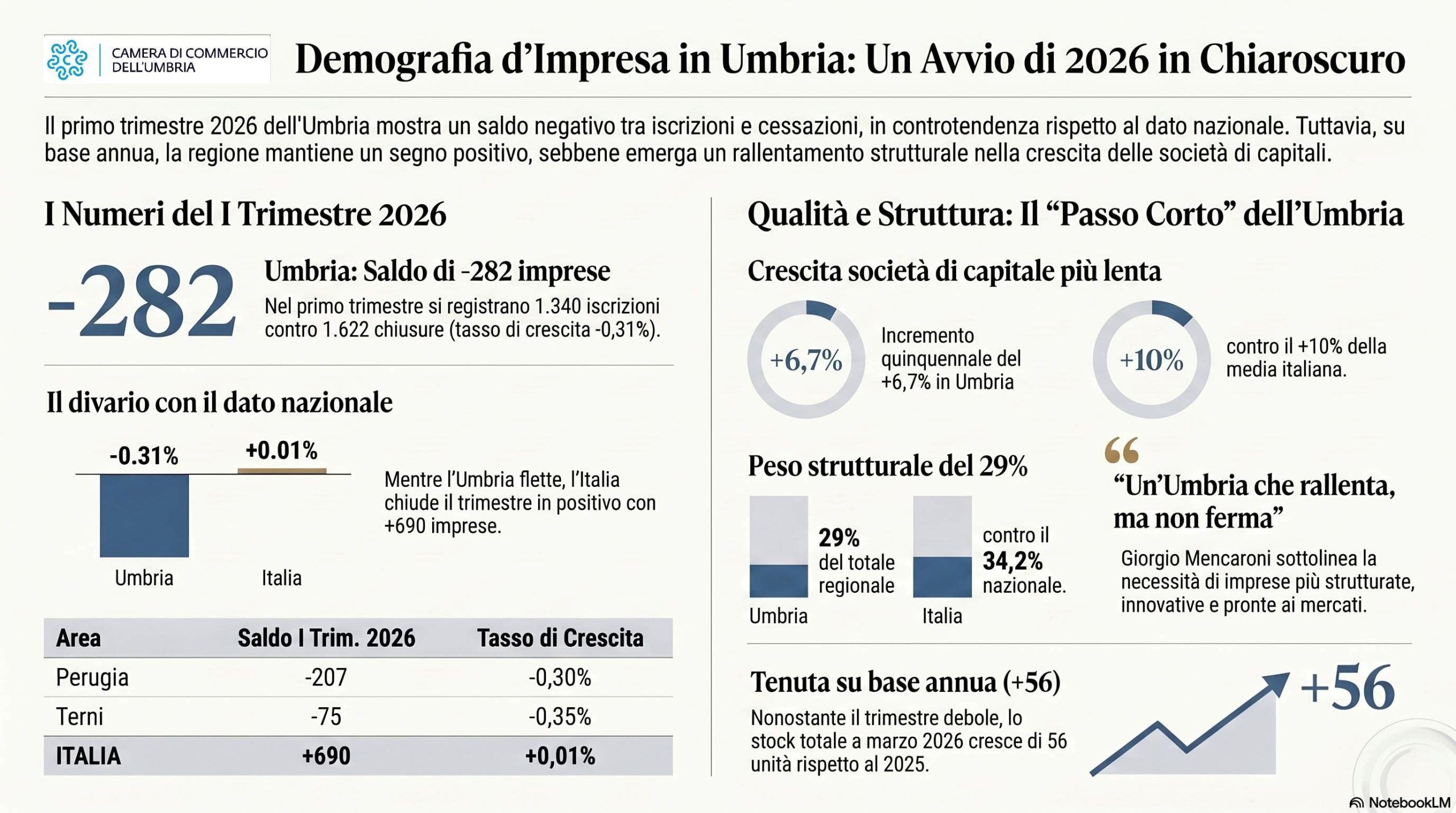 Più chiusure che aperture di nuove imprese nei primi tre mesi del 2026 in Umbria, che perde 282 aziende. Sono state 1.340 le nuove imprese, 1.622 quelle chiusure.. Il tasso di crescita trimestrale segna -0,31%, contro il +0,01% italiano.