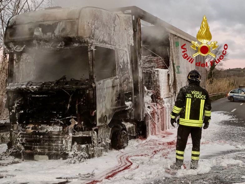 A fuoco un mezzo pesante che trasportava materiali edili, andato completamente distrutto nel viadotto Volumini, poco dopo la galleria, in direzione Roma.