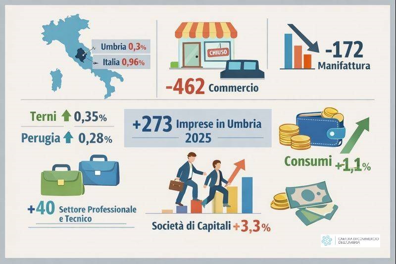 Nel 2025 è aumentato il numero delle imprese in Umbria, ma la crescita è lenta e resta lontana dalla media nazionale. Dal punto di vista territoriale, Terni fa meglio di Perugia. Tra i settori, pesa il calo del commercio, che in un anno perde 462 attività, mentre crescono servizi e professioni.
